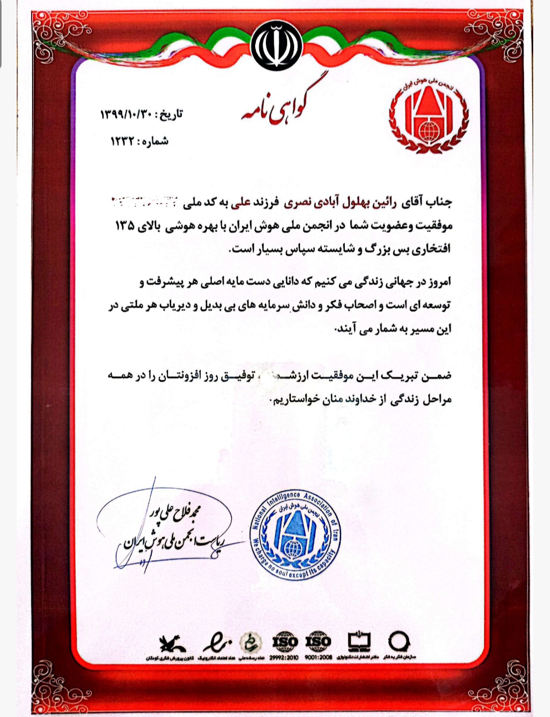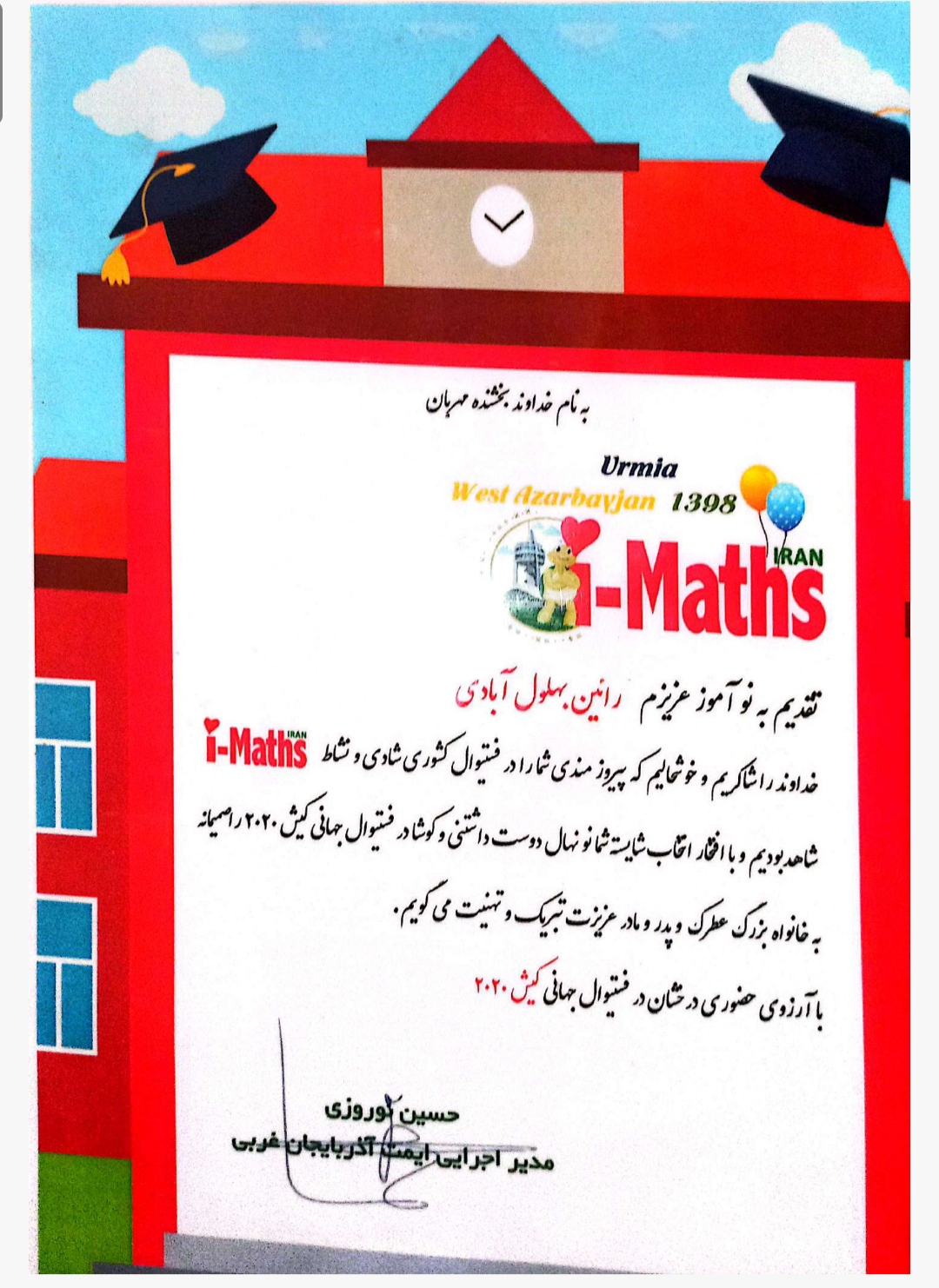 من قبل از اینکه وارد مدرسه شوم در مسابقات آیمت شرکت کردم و پس از کسب عنوان در سطح شهر و استان و کشور ، به عنوان نماینده ایران عزیز در مسابقات جهانی آیمت شرکت کردم و توانستم مقام سوم را کسب کنم .اول دبستان را خاطر شیوع بیماری کرونا به صورت آنلاین گذراندم و مقطع دوم دبستان را جهشی کردم . در واقع من برای اولین بار در مقطع سوم دبستان با محیط مدرسه آشنا شدم.