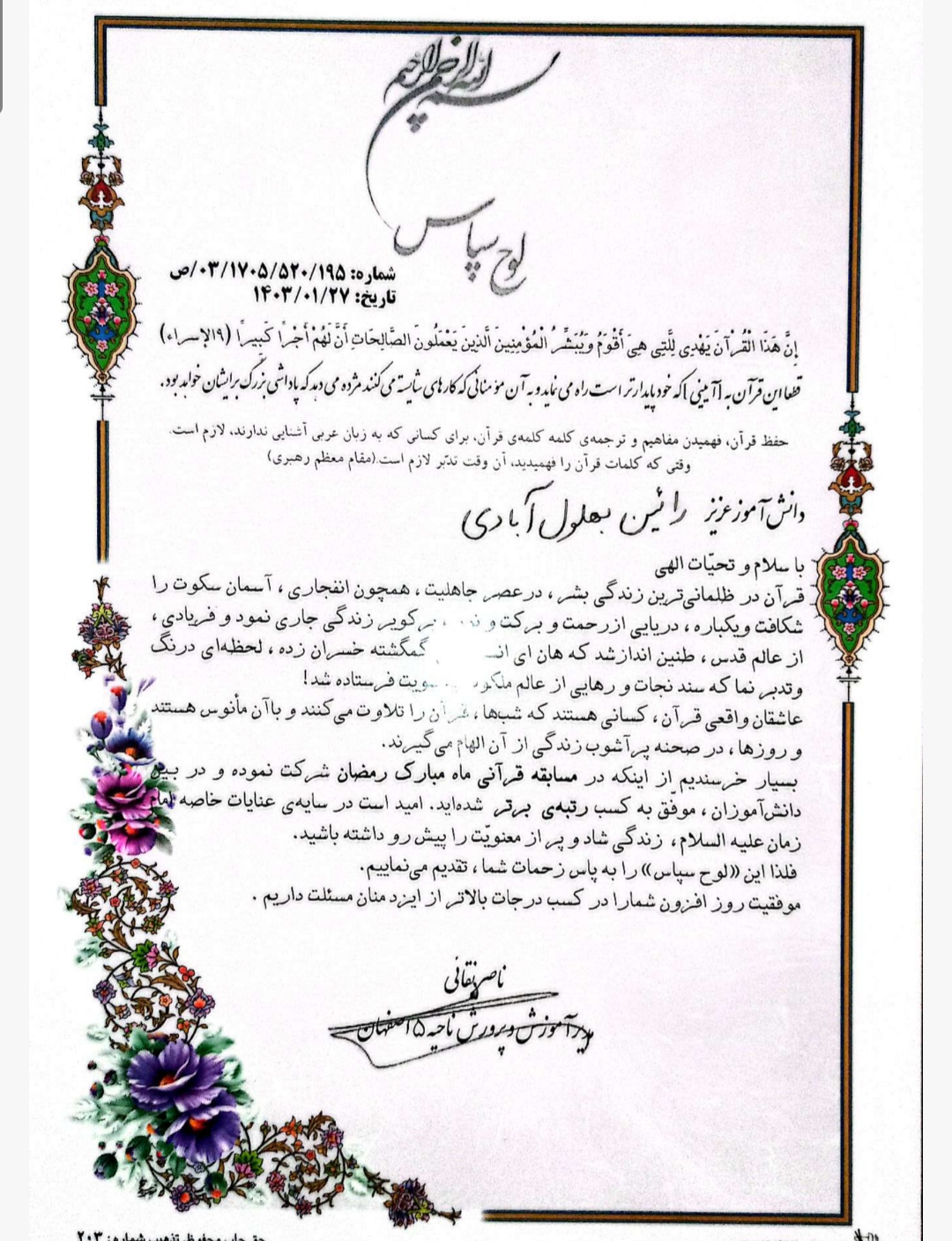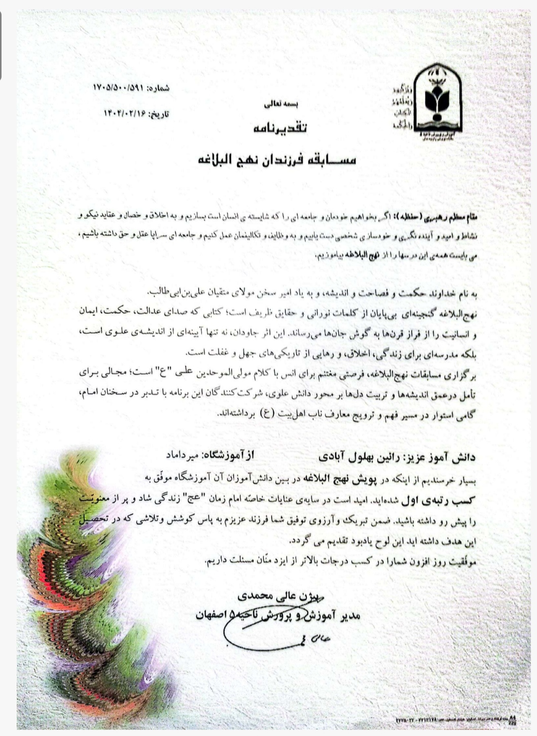 همچنین در مسابقات فرزندان نهجالبلاغه جزو نفرات برتر شدم